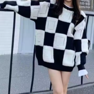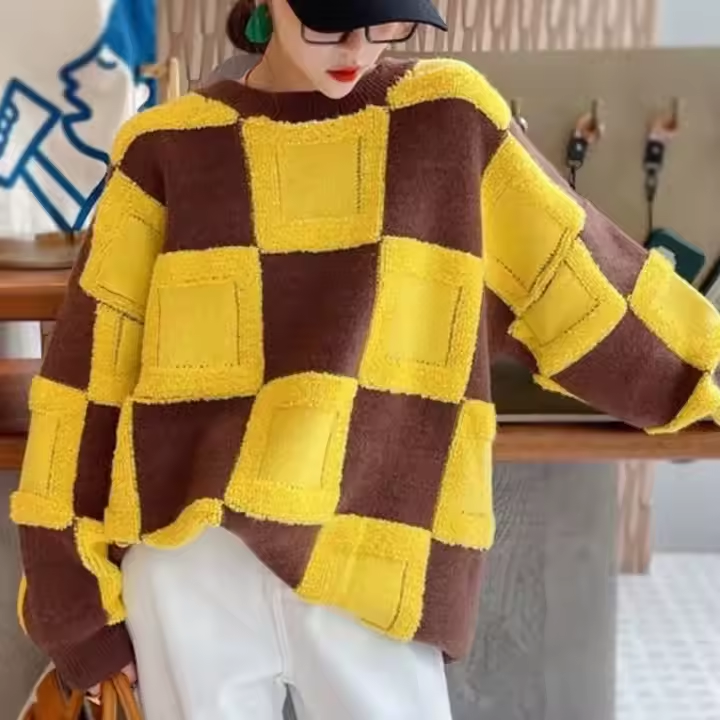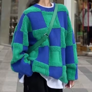 Stay cozy and stylish this winter with our Color Block Plaid Knit Sweater for Women. Designed with a relaxed fit and crafted using high-quality polyester, nylon, and cotton, this sweater delivers both comfort and durability. The bold plaid pattern adds a trendy touch, while the embroidered detail at the hemline offers a subtle hint of elegance.