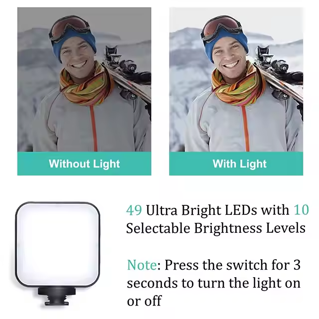- LED Fill Light (49 beads) – Delivers soft, balanced lighting with a 5600K color temperature, ideal for indoor or outdoor shooting.
